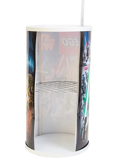 Puede ir transpararente para exhibición de productos o totalmente rotulado. Usualmente se utiliza para degustación de alimentos.